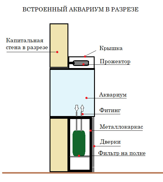 В момент проектирования надо учесть массу нюансов, внешние размеры ёмкости аквариума должны учитывать компенсационные зазоры (обычно по 1 см с каждой стороны), продумать вариант доступа, необходимо разместить хорошее освещение, спланировать, где расположить и как подключить внешнее оборудование. В качестве наглядного примера, мы разместили эскиз с одним из вариантов планировки встроенного аквариума.