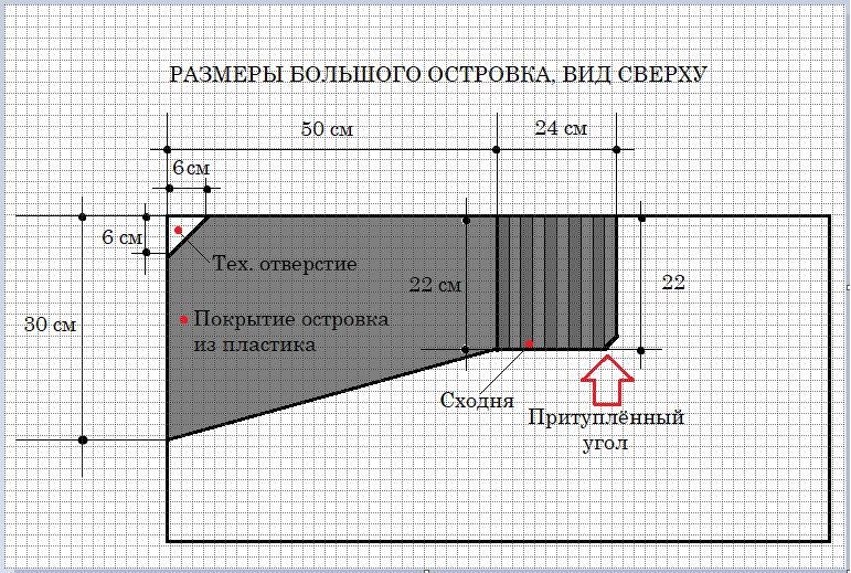 Мы поработали с функционалом островка акватеррариума, нас часто просили сделать угловое отверстие для того, чтобы под островок можно было спрятать часть оборудования, водный обогреватель, внутренний фильтр или трубку внешнего фильтра, как показано на схеме, теперь отверстие есть (СМ. СХЕМУ).