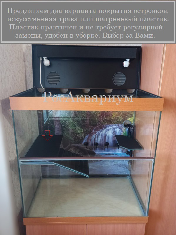 Мы поработали с функционалом акватеррариума, была модернизирована сходня. Сходня оснащается удобными пластиковыми ступеньками (СМ. ФОТО). Покрытие из искусственной травки очень ненадежное, под коготками черепах оно быстро разрушается, кто уже содержал черепах, понимают, о чем идёт речь. Травка выдирается из основания сходни, попадает черепахе в кишечник, суровые нитки плавают в воде и забивают фильтр. По этим причинам, мы предлагаем 2-ва варианта покрытия самого островка акватеррариума, покрытие из искусственной травки или покрытие из черного пластика с шагреневой поверхностью (при заказе надо уточнить).