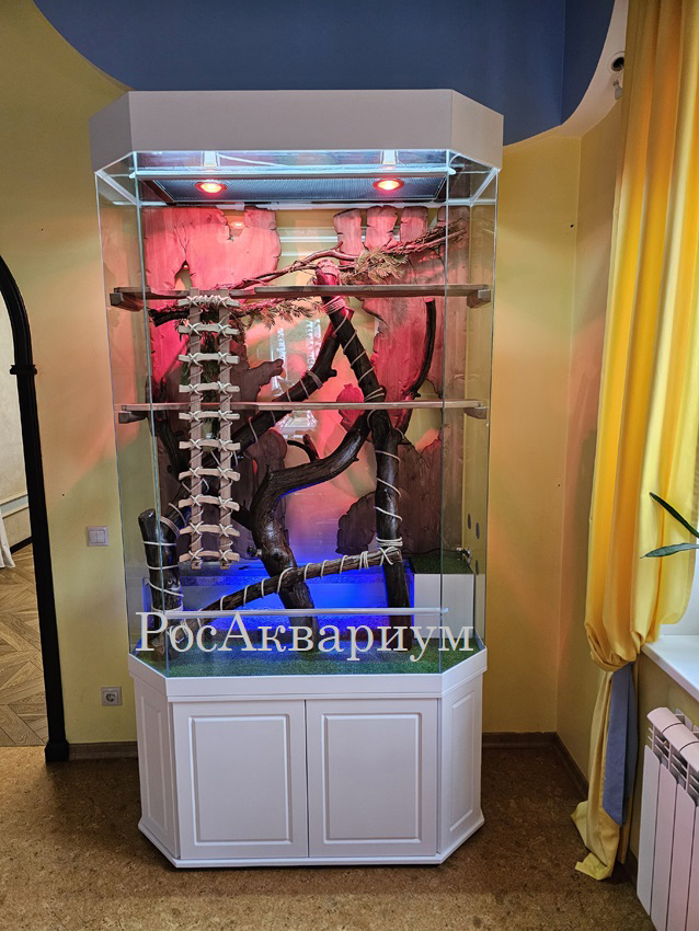 Многоуровневый вертикальный террариум, оснащённый водоёмом, подсветкой, корягами, полками, лесенкой.
